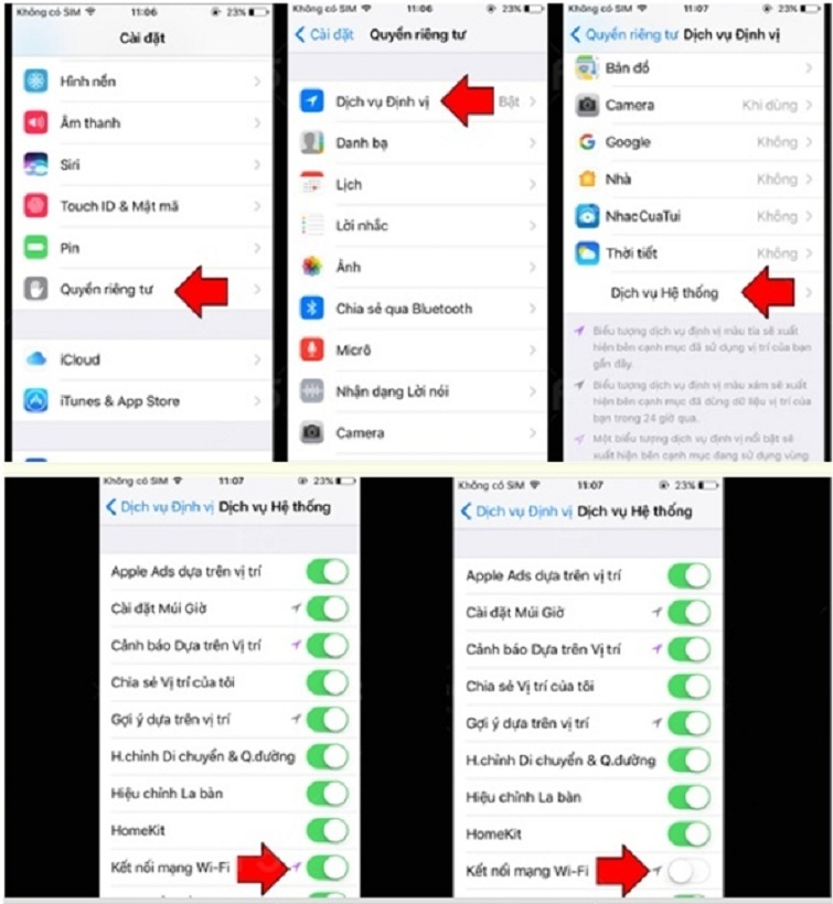 Nguyên nhân có thể là do dịch vụ định vị kết nối mạng wifi, gây ra tình trạng tải ứng dụng chậm trên điện thoại iPhone. Để khắc phục tình trạng này, bạn có thể tắt dịch vụ định vị. Hãy thực hiện theo các bước sau: Cài đặt >> Quyền riêng tư >> Dịch vụ định vị >> Dịch vụ hệ thống >> Tắt kết nối mạng wifi.