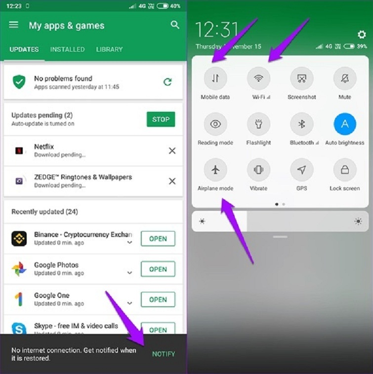 Đôi khi điện thoại không thể tải được ứng dụng trên CH Play do bị gián đoạn kết nối wifi. Bạn có thể khắc phục lỗi này bằng cách tắt tính năng wifi trên điện thoại, sau đó chuyển sang sử dụng dữ liệu di động mạng 3G hoặc 4G. Một cách khác là chuyển điện thoại sang chế độ máy bay (Airplane Mode) để vô hiệu hóa các kết nối trong vài phút. Cuối cùng, bạn kích hoạt lại chế độ để sử dụng bình thường trở lại.