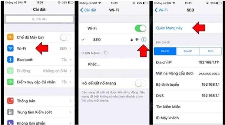 Lỗi cũng có thể xuất phát từ vấn đề kết nối mạng. Đơn giản, bạn có thể giải quyết bằng cách xóa kết nối mạng và sau đó kết nối lại. Thực hiện bước này như sau: Vào Cài đặt >> Wifi >> Chọn biểu tượng chữ "I" >> Quên mạng này. Sau đó, bạn chỉ cần kết nối lại bằng cách chọn lại mạng và nhập mật khẩu truy cập nếu cần.