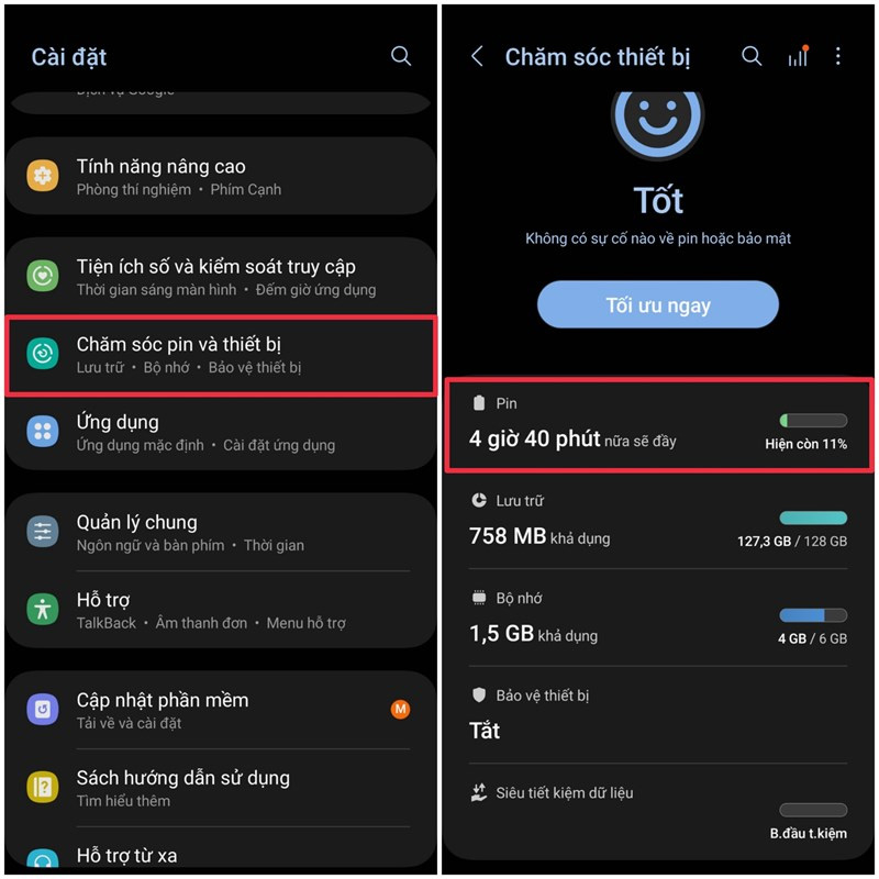 Kiểm tra lịch sử sử dụng ứng dụng trong Cài đặt → Chăm sóc thiết bị → Pin → Sử dụng pin. Nếu thấy "Màn hình" chiếm tỷ lệ bất thường cao (trên 40% tổng lượng pin tiêu thụ), đây là dấu hiệu rõ ràng của vấn đề.