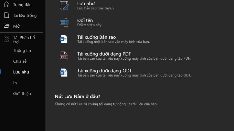 Sau khi chỉnh sửa, vào Tệp > Lưu như > Chọn Tải xuống Bản sao (file Word) hoặc Tải xuống dưới dạng PDF để hoàn tất.