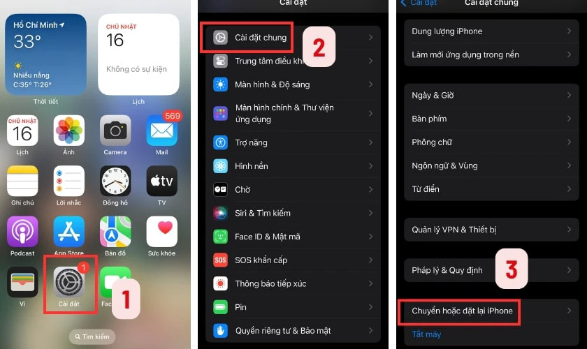 - Vào Cài đặt → Chung → Chuyển hoặc Đặt lại iPhone