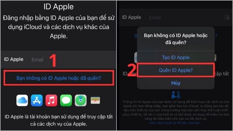 Chọn Bạn không có Apple ID hoặc đã quên? > Quên Apple ID?.