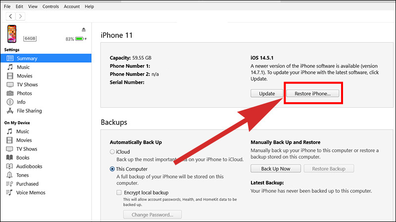 Bước 3: Chọn Restore iPhone để khôi phục cài đặt gốc.