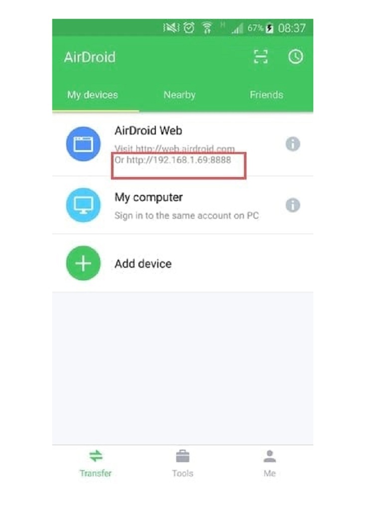 Khi mở AirDroid, ứng dụng sẽ hiển thị một địa chỉ IP (ví dụ: 192.168.1.69:8888) hoặc một địa chỉ web.