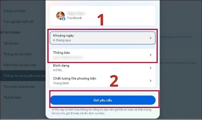 Bước 5: Tiếp theo, hãy tiến hành điều chỉnh Khoảng ngày cần khôi phục tin nhắn và chọn Gửi yêu cầu. Cuối cùng, bạn chỉ cần chờ đợi cho đến khi Facebook tải file hoàn tất và nhập mật khẩu tài khoản vào để kết thúc.