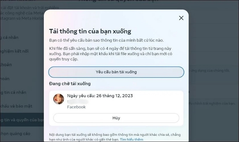 Bước 2: Tiếp theo, bạn nhấn vào tùy chọn Thông tin của bạn trên Facebook >> Chọn mục Tải xuống thông tin trên trang cá nhân.
