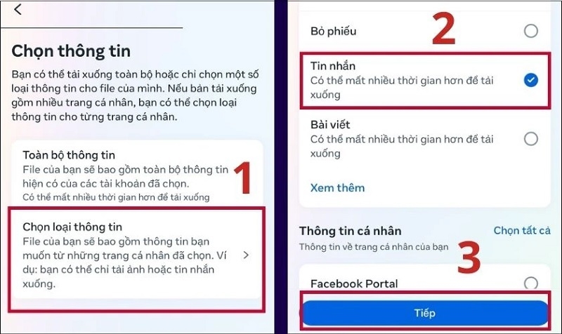 Bước 4: Tại phần Chọn thông tin, bạn nhấn vào tùy chọn Chọn loại thông tin >> Chọn Tin nhắn và nhấn nút Tiếp.