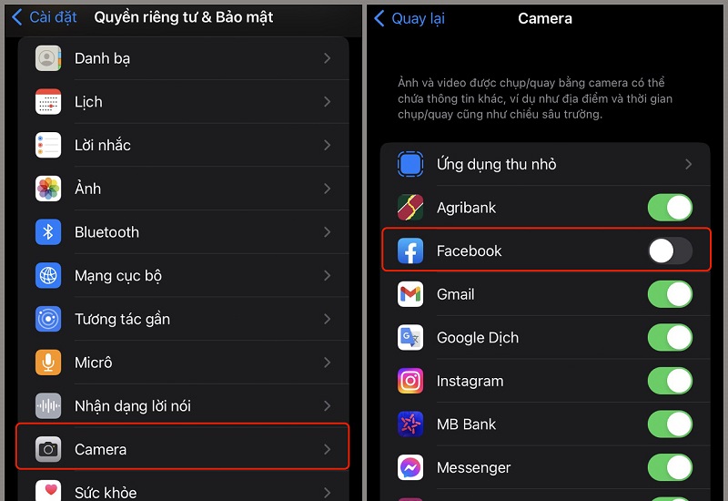 - Vào Cài đặt > Quyền riêng tư (Privacy) > Camera, kiểm tra xem app camera có được phép không. Nếu không, bật lên.