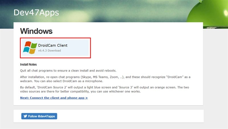 - Tải DroidCam Client từ trang chủ dev47apps.com cho máy tính