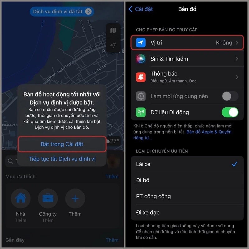Bước 3: Tại giao diện mới, bạn nhấn vào tùy chọn Bật trong Cài đặt. Ngay sau đó, bạn sẽ được chuyển đến giao diện Cài đặt trên iPhone. Chọn Vị trí để tiếp tục.