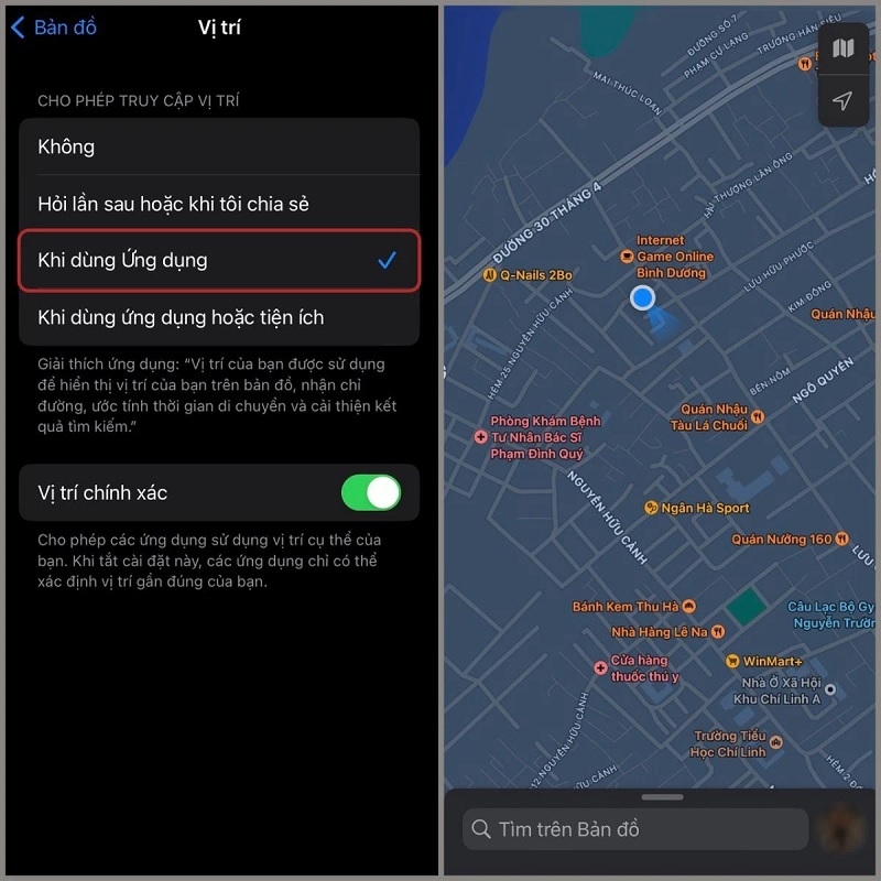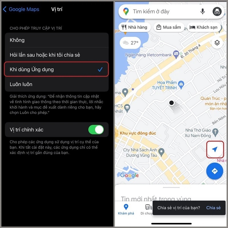 Bước 4: Tiếp theo, bạn nhấn vào tùy chọn Khi dùng ứng dụng. Như vậy sẽ cho phép ứng dụng Google Maps truy cập vào vị trí hiện tại của bạn để xác định chính xác.