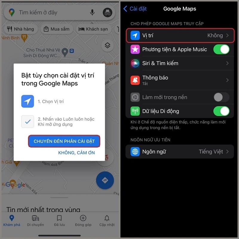 Bước 3: Khi cửa sổ Cài đặt hiển thị, bạn chọn vào mục Vị trí. Lúc này, những tùy chọn cho phép ứng dụng Google Maps truy cập vào vị trí hiện tại của bạn sẽ xuất hiện.