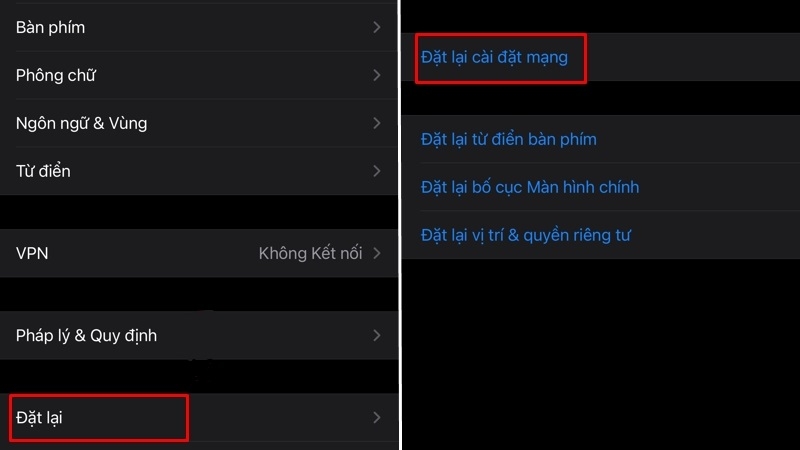 Đây là cách hiệu quả nhất khi iPhone vẫn bị mạng EDGE sau khi thử các cách trên. Đặt lại cài đặt mạng sẽ xóa tất cả các cấu hình mạng Wi-Fi, Bluetooth, VPN và cài đặt di động, giúp iPhone thiết lập lại kết nối từ đầu.