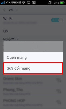 Bước 1: Vào mục cài đặt => Wifi => nhấn giữ vào mạng wifi một vài giây cho tới khi xuất hiện hộp thoại => chọn sửa đổi mạng.