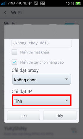 Bước 2: Để tiếp tục khắc phục Oppo Neo 7 không kết nối được Wifi. Bạn hãy chọn phần hiển thị tùy chọn nâng cao sau đó thiết lập phần Cài đặt IP là tĩnh.
