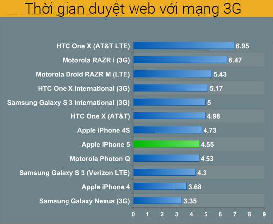 Dung lượng pin iphone 5 khi duyệt web bằng 3G trung bình là 4.55 giờ.