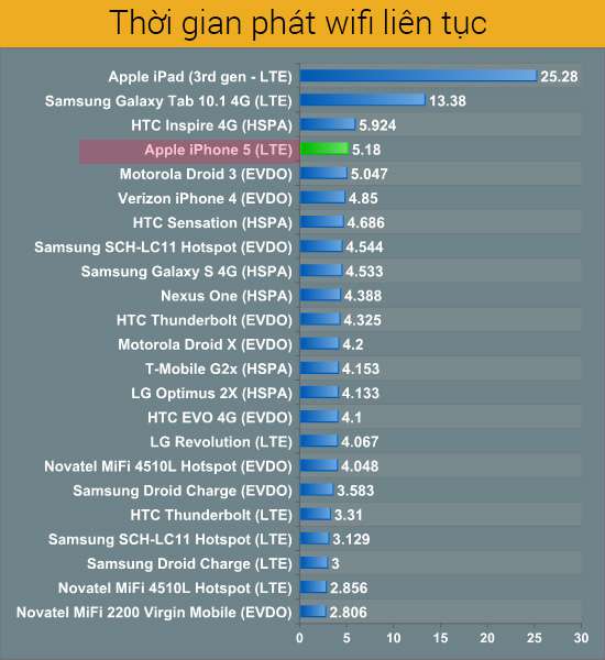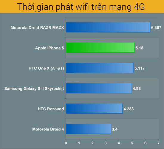 Phát wifi cho thiết bị khác bằng mạng 4G là 5.18 giờ.