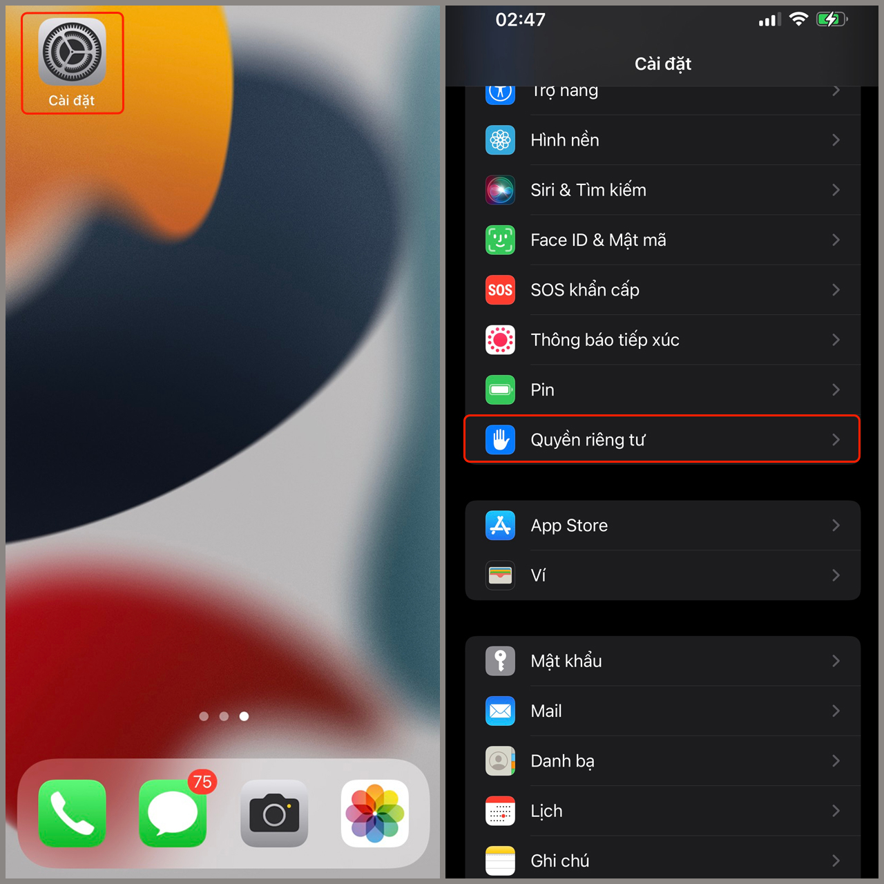 Bước 1: Mở Cài đặt → Quyền riêng tư & Bảo mật