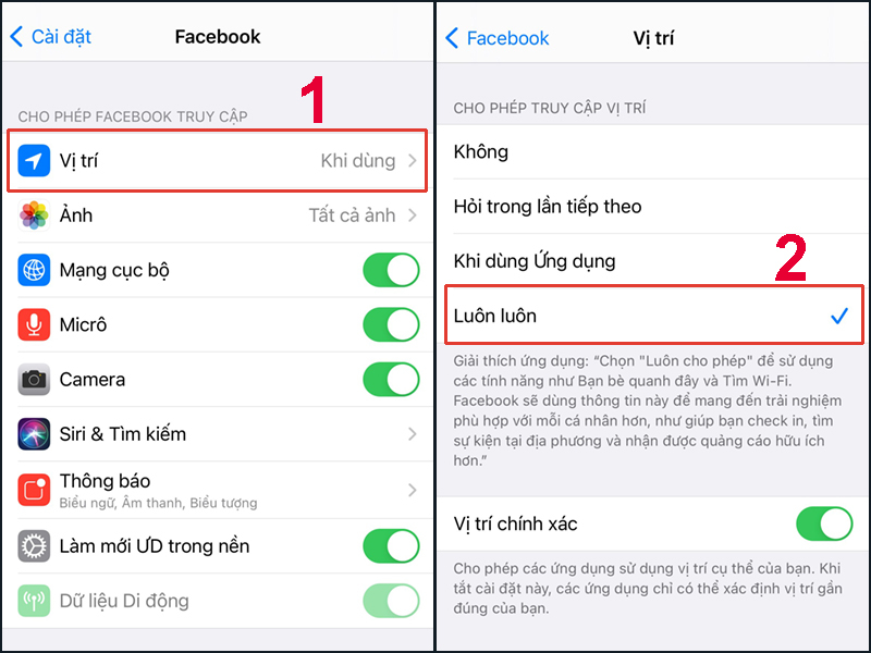 - Trên iPhone: Cài đặt → Facebook → Vị trí → Khi đang dùng ứng dụng