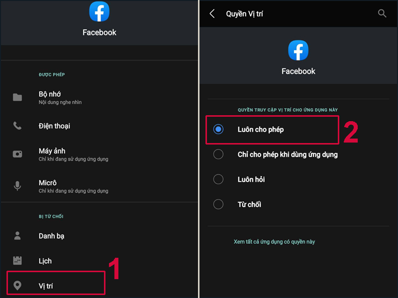 - Trên Android: Cài đặt → Ứng dụng → Facebook → Quyền → Vị trí → Cho phép