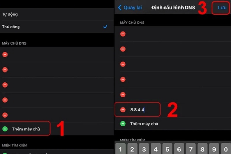 Thêm máy chủ DNS: Nhập 8.8.8.8 hoặc 8.8.4.4 (Google DNS) hoặc 1.1.1.1 (Cloudflare DNS).