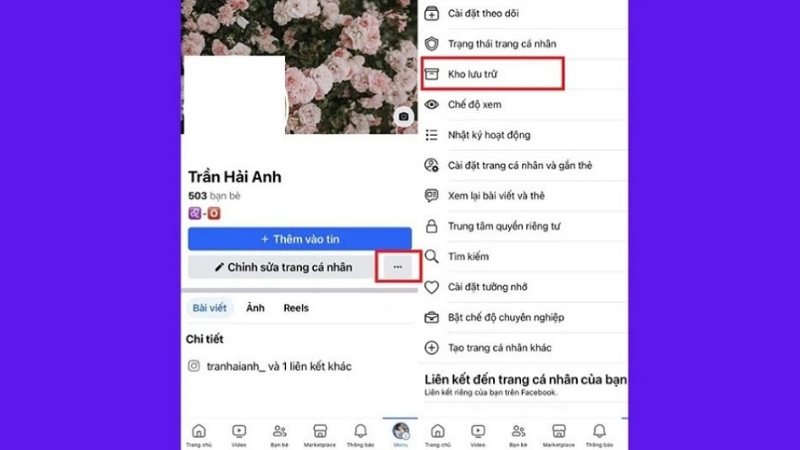 - Bước 1: Bạn mở ứng dụng facebook lên trên điện thoại. Sau đó, truy cập vào Trang cá nhân >> Nhấn vào biểu tượng dấu 3 chấm và nhấn vào tùy chọn Kho lưu trữ.
