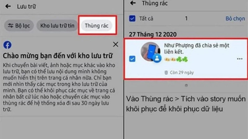 - Bước 2: Tại giao diện Lưu trữ mới hiển thị, bạn nhấn vào tab Thùng rác. Sau đó, hãy tìm kiếm story bạn cần lấy lại và nhấn nút Khôi phục để hoàn tất.