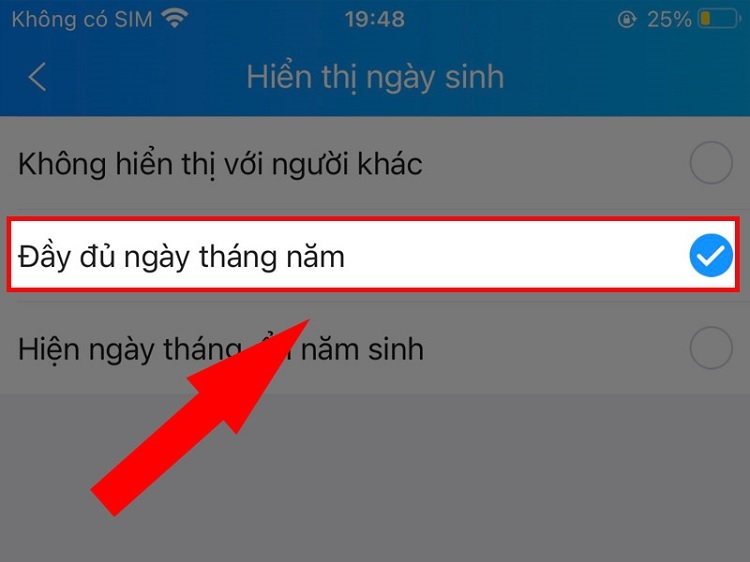 Đối với trường hợp bạn muốn bật lại thông báo sinh nhật của mình trên Zalo, bạn có thể thực hiện theo các bước tương tự như cách tắt thông báo sinh nhật trên Zalo cho đến bước 3. Sau đó, hãy đánh dấu tích vào tùy chọn "Đầy đủ ngày tháng năm" là được. Điều này sẽ kích hoạt thông báo sinh nhật và bạn sẽ nhận được thông báo vào ngày sinh nhật của mình.