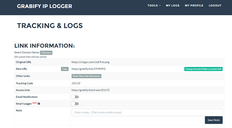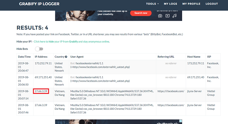 Bước 4: Hãy gửi link đó cho facebook, zalo của bạn bè bạn, khi người đó đã click vào chúng ta quay trở lại Grabify. Truy cập danh mục: My Logs – nhật kí của tôi: