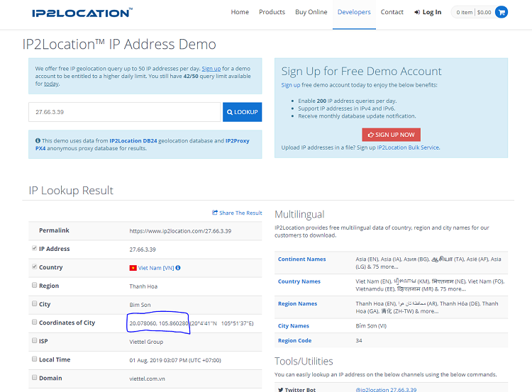 Bước 6: Truy cập website: https://www.ip2location.com và sau đó dán ID chúng ta đã lấy được vào ô tìm kiếm. Ngay chỗ “Coordinates of City” bạn sẽ lấy được địa chỉ cụ thể trên bản đồ. Copy lại nào!