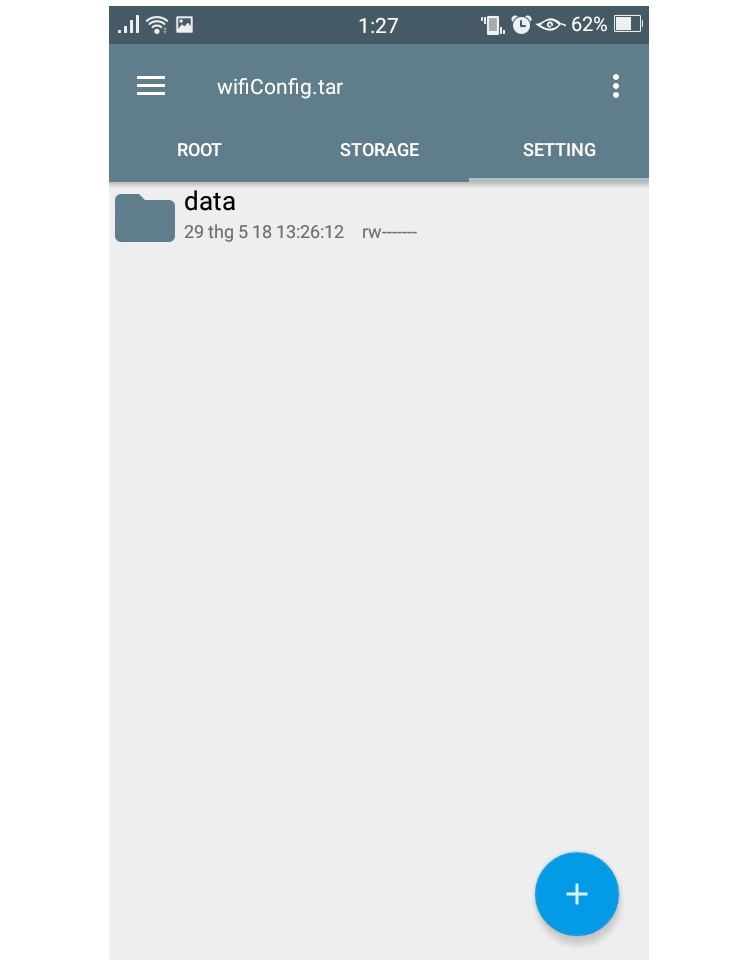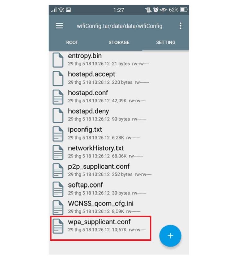 Bước 7: Để tiếp tục, bạn nhấn vào file đó rồi chọn Setting. Sau đó, chọn vào wifiConfig.tar.