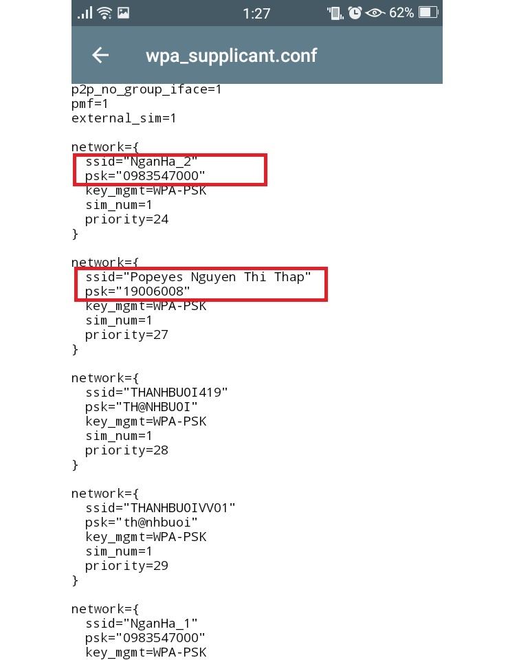 Bước 10: Ngay sau đó, tên và mật khẩu wifi sẽ được hiển thị ra dưới dạng ssid và psk. Bạn hãy tìm Wifi mà các bạn đang muốn biết mật khẩu là được.