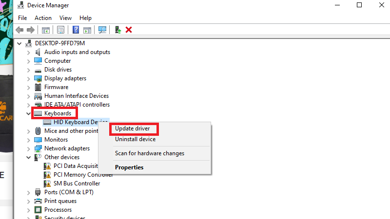 - Mở rộng Keyboards, click phải vào HID Keyboard Device hoặc Standard PS/2 Keyboard → Update driver hoặc Uninstall device rồi restart máy để Windows tự cài lại.