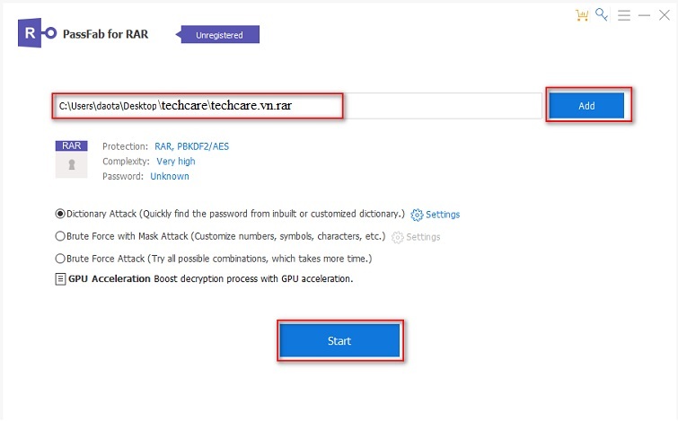 - Sử dụng: Mở ứng dụng, thêm file RAR qua nút "Add", rồi nhấn "Start" để bắt đầu quá trình khôi phục.