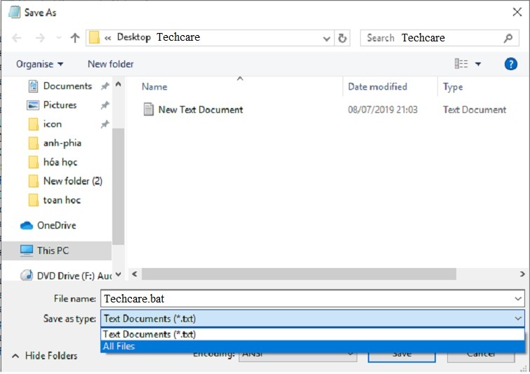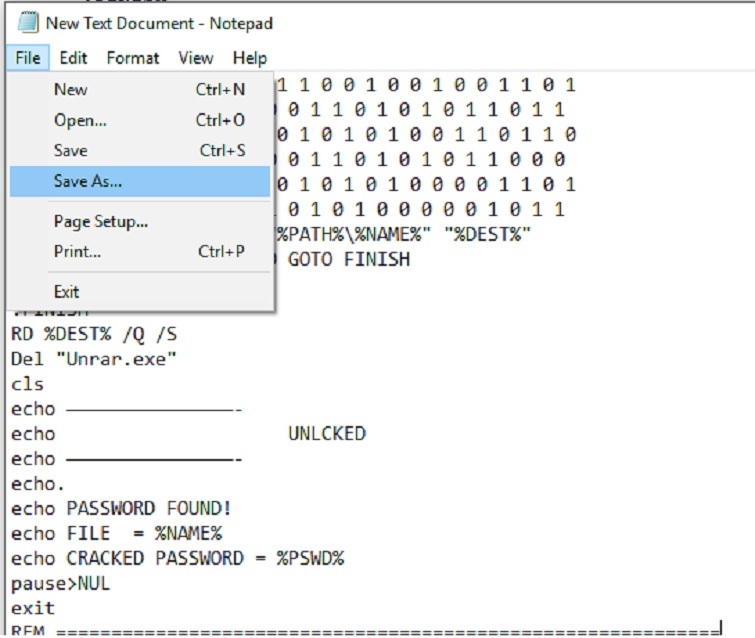 - Lưu file: Chọn "Save as" với định dạng .bat (ví dụ: techcare_rar_unlock.bat) và loại file "All files".