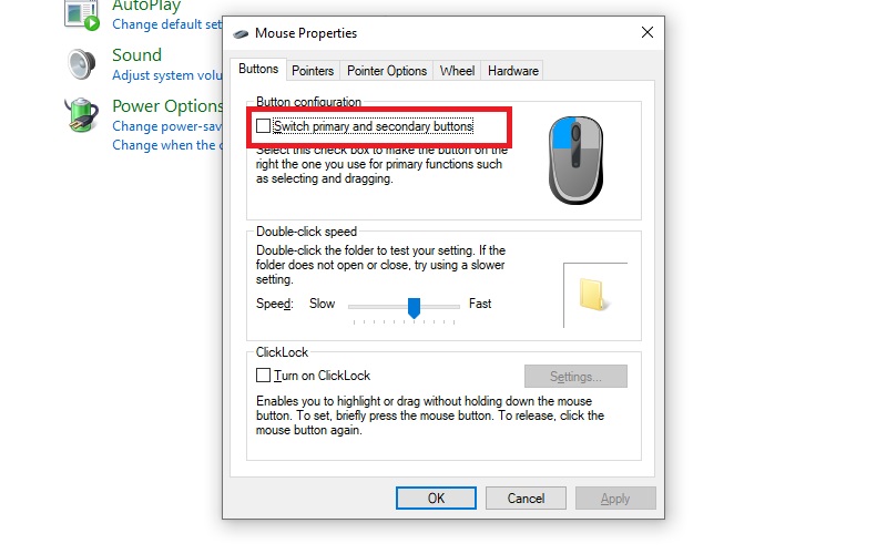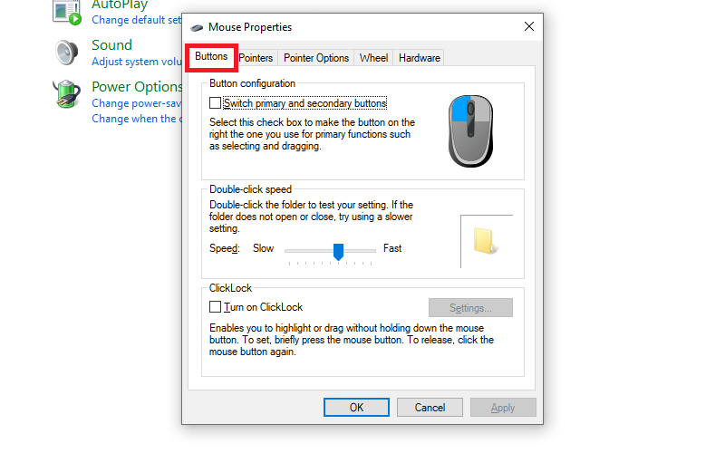 - Tốc độ nhấp chuột: Điều chỉnh Double-click speed trong Buttons tab.