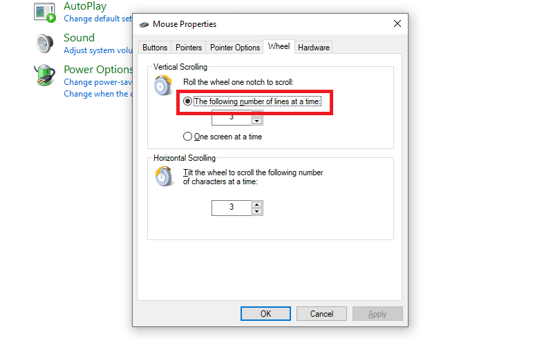 - Số dòng cuộn mỗi lần: Trong Wheel tab, đặt Lines to scroll at a time.