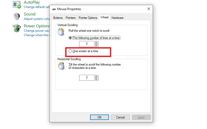 - Cuộn từng trang hay từng dòng: Chọn One screen at a time cho cuộn trang.