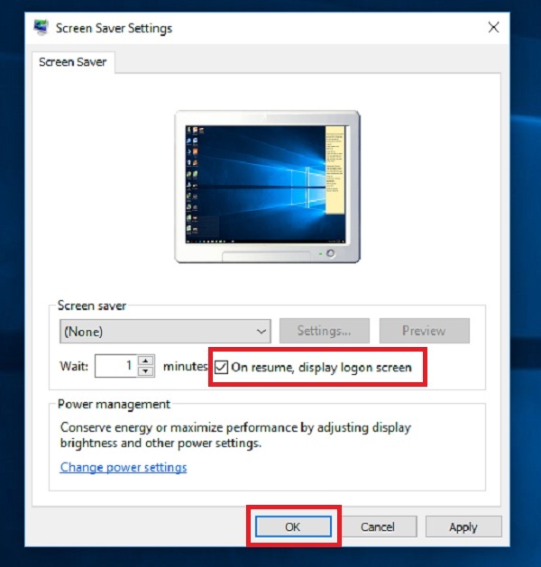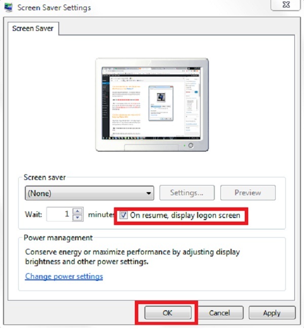 Sau khi thao tác xong, bạn sẽ thấy xuất hiện hộp thoại Settings. Tại đây, bạn hãy tick chọn vào ô On resume, display logon screen và nhấn OK để hoàn tất.