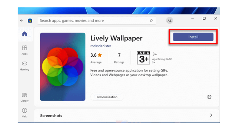 Bước 1: Mở Microsoft Store, tìm kiếm "Lively Wallpaper" → Nhấn Cài đặt.