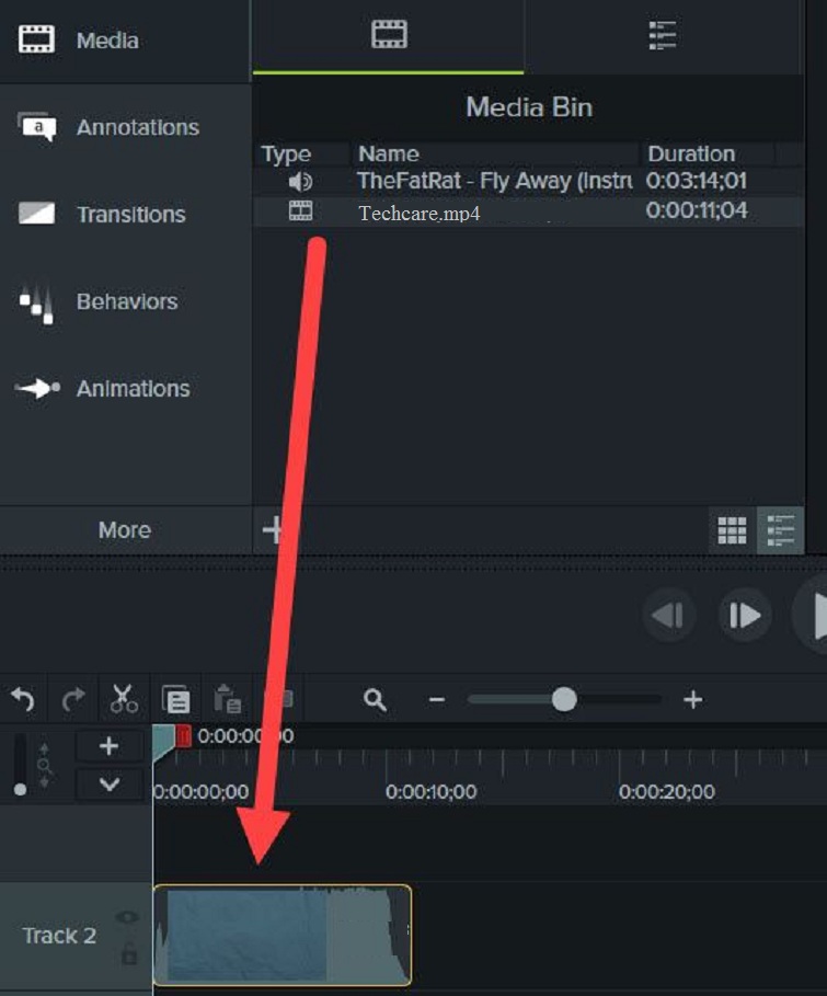 Bước 3: Tiếp theo, bạn kéo thả video xuống Track, Track mấy sẽ tùy thuộc ở bạn, mục đích là để nó được xuất hiện trên layer làm việc của phần mềm Camtasia Studio.