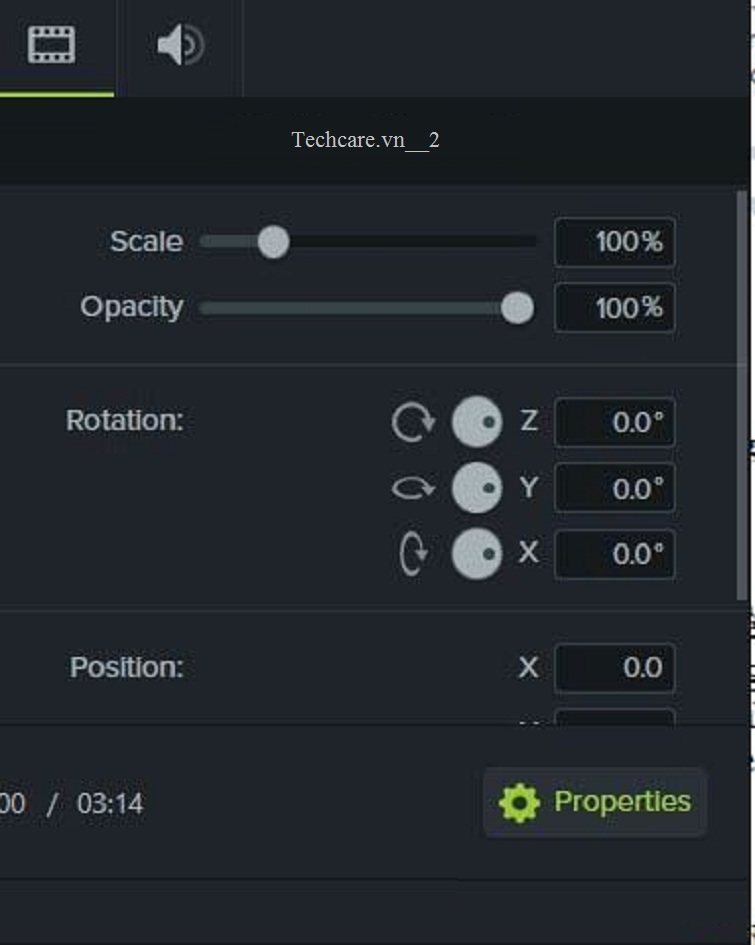 Bước 6: Click chuột vào file video ở dưới phần timeline, ở góc phải bên dưới phần Properties, ở đó các bạn có thể chỉnh độ mờ hay phóng to hình ảnh tùy ý.