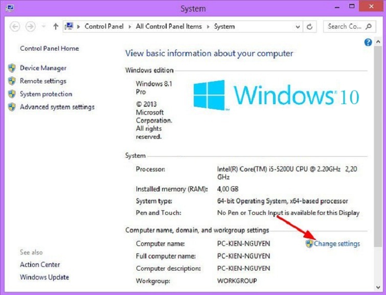 Thực hiện: Click chuột phải vào Computer (This PC) => Chọn Properties => Sau đó, chọn Change settings như hình dưới đây.