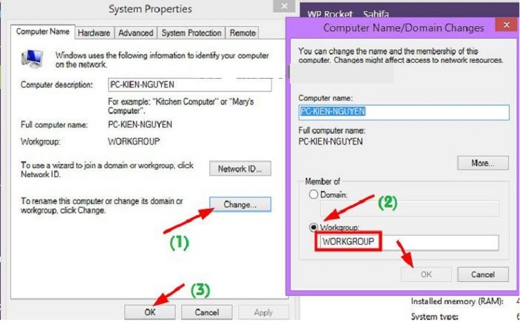 Trong trường hợp 2 máy tính vẫn chưa được kết nối với nhau, các bạn cần tiến hành thêm một bước nữa. Đó là đổi chúng về cùng một WORKGROUP hoặc cùng MSHOME.