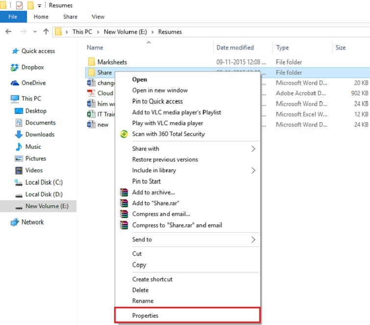 Bước 1: Đầu tiên, các bạn kích chuột phải vào thư mục mà bạn muốn chia sẻ. Sau đó, hãy click chọn Properties.