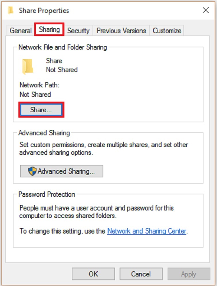 Bước 2: Tại Sharing Properties mới hiển thị, bạn chọn thẻ Sharing. Sau đó, bạn nhấn nút Share ở bên dưới mục Network file and Folder Sharing.