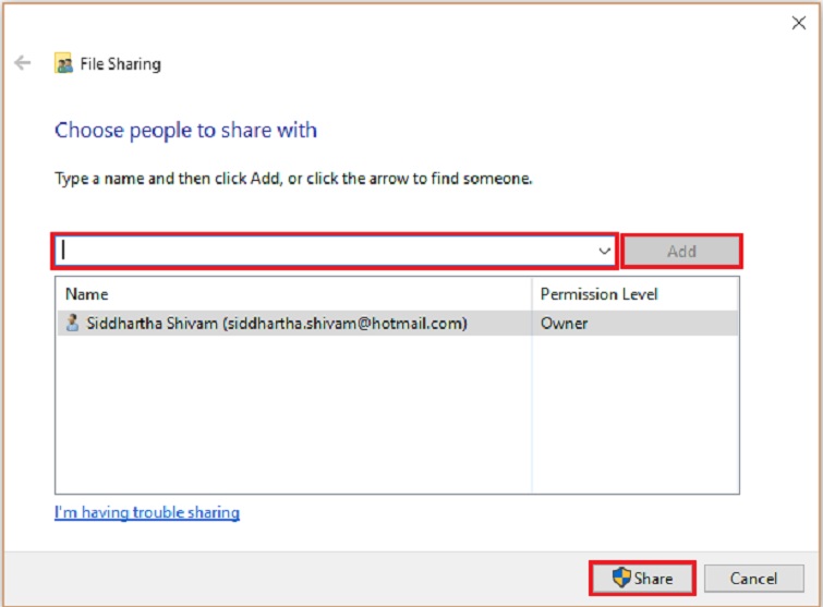 Bước 3: Ở bước này, bạn sẽ nhập tên người mà bạn muốn chia sẻ thư mục. Cho đến khi đã thêm xong tên vào danh sách chia sẻ, bạn chọn Share.