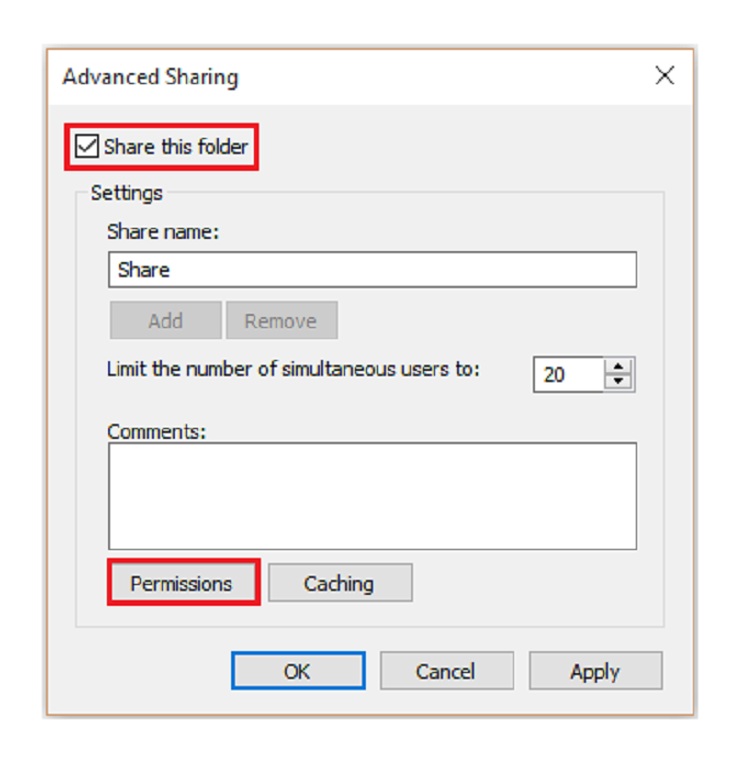 Bước 5: Đánh vào dấu tích tùy chọn Share this folder và click chuột chọn Permissions.