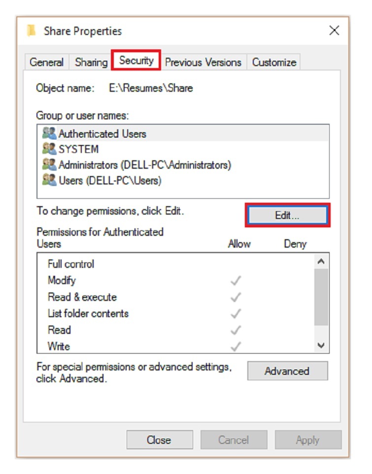 Bước 7: Click chuột chọn thẻ Security. Để thay đổi được quyền cho phép, bạn hãy click chọn vào nút Edit.